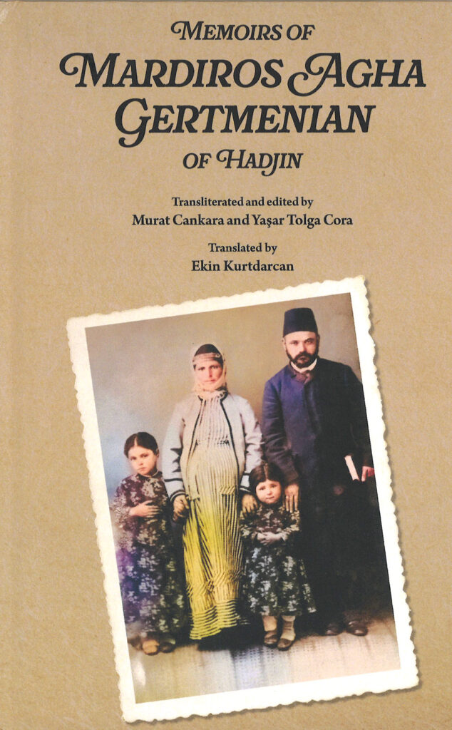 Dennis Gertmenian, Pasadena, CA, for a copy of Memoirs of Mardiros Agha Gertmenian of Hadjin (Gertmenian Fam-ily Foundation, 2025), 95pp., in English, with photos, translated and edited by Murat Cankara and Yaşar Tolga Cora and translated by Ekin Kurtdarcan. The book recounts the memoirs of Dennis Gertmenian’s great-grandfather, Mardiros Agha Gertmenian, who was a native of Hadjin. The book offers a rare first-hand account of life in Hadjin, which was almost solely inhabited by Armenians. Gertmenian depicts the forced removal of Armenians, the brief return of survivors during French control, and the ultimate final removal and destruction by Turkish forces. The memoirs are an invaluable testimony to the history of the town and its people from the perspective of a man whose life story was intermingled with the story of his birthplace and its community.
